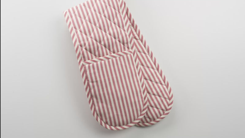 Protect your hands in style with this striped 100% cotton double oven glove in beautiful rose. Designed for comfort and safety, it features a polyester thermal lining inside each hand pocket and on the reverse for extra heat protection. A handy hanging loop at the center allows you to display it as a decorative kitchen accent when not in use. Perfect for baking, roasting, and everyday cooking.